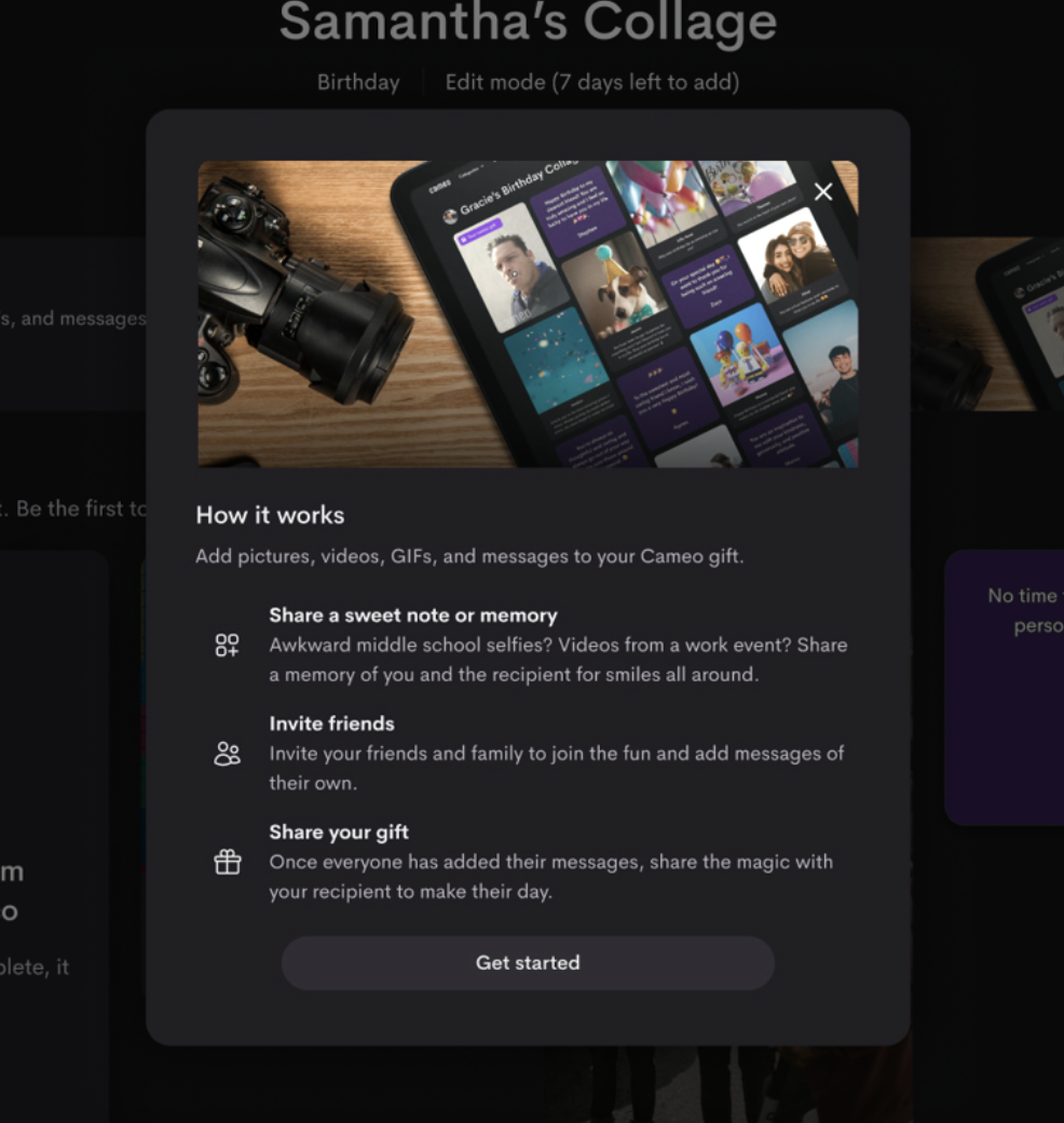 Cameo Collage invites users to create a digital collage of their Cameo video featuring pictures, videos, and written messages from friends and family.